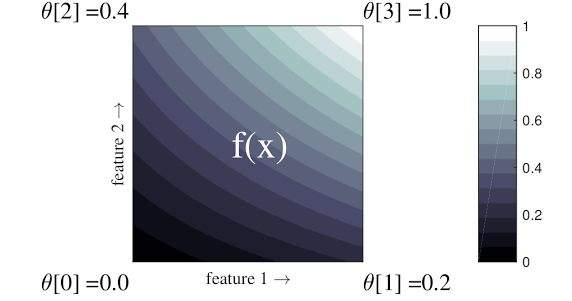 مثال ساده بالا تابعی با 2 ویژگی ورودی و 4 پارامتر است:\(\theta=[0, 0.2, 0.4, 1]\)، که مقادیر تابع در گوشه های فضای ورودی هستند. بقیه تابع از این پارامترها درون یابی می شود.