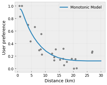 - یکنواختی : می توانید تعیین کنید که خروجی فقط با توجه به یک ورودی افزایش یا کاهش یابد. در مثال ما، ممکن است بخواهید مشخص کنید که افزایش فاصله تا یک کافی شاپ فقط ترجیحات پیش بینی شده کاربر را کاهش دهد.