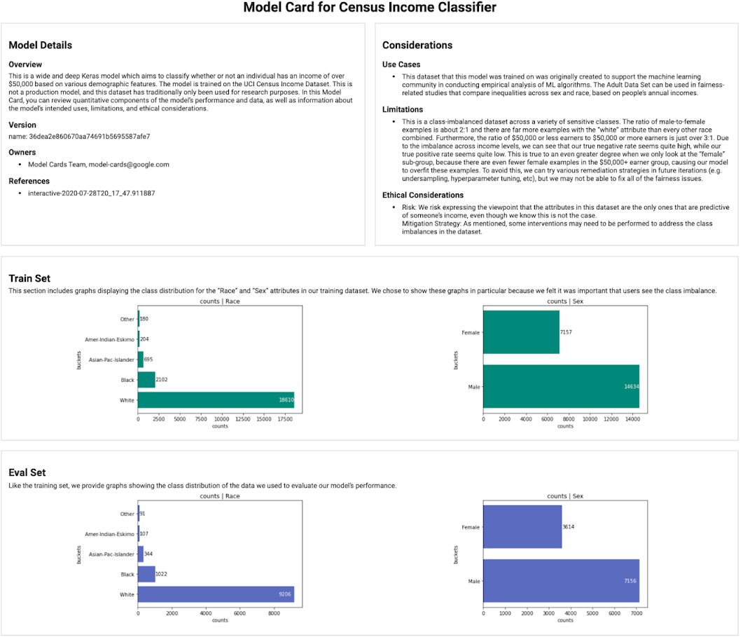 MCT מאחסן שדות כרטיסי דגם באמצעות סכימת JSON . MCT יכול לאכלס באופן אוטומטי שדות אלה עבור משתמשי TFX באמצעות ML Metadata (MLMD) . ניתן לאכלס ידנית את שדות כרטיס הדגם גם באמצעות Python API . כמה מקרי שימוש בכרטיסי דגם כוללים: