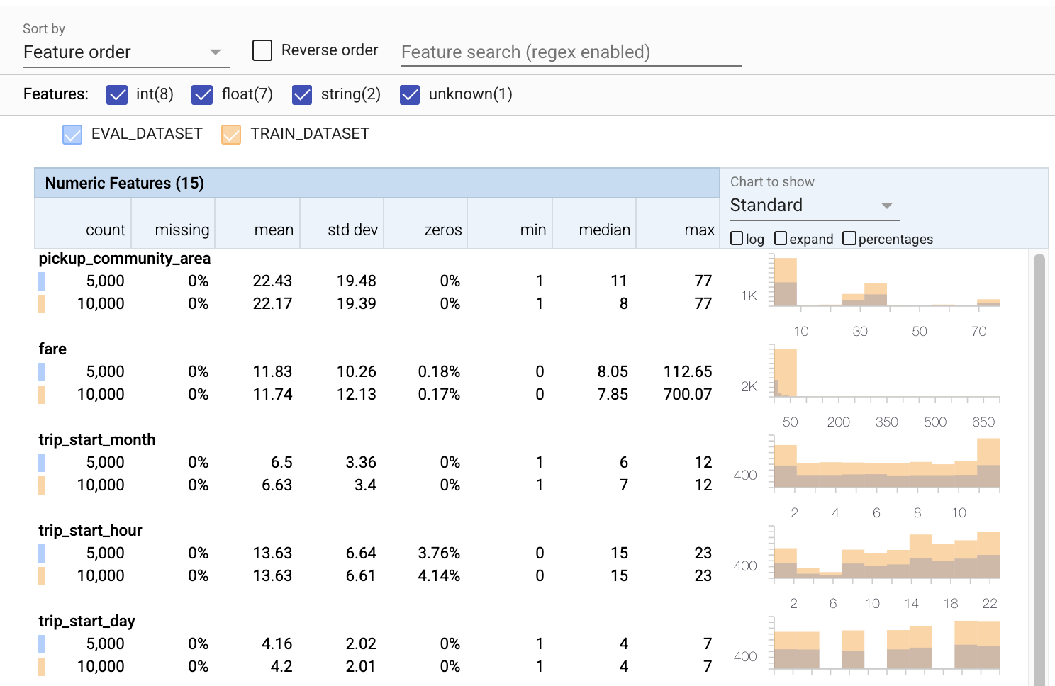 - 各機能に、トレーニングデータセットと評価データセットの両方の統計が含まれていることに注意してください。